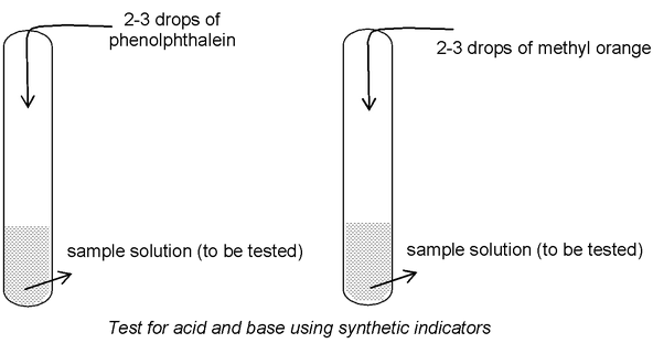 Experiment to test: Take about 2 ml of sample solution (substance to be tested) in two test tubes and add 2-3 drops of phenolphthalein and methyl orange (synthetic acid-base indicators) to then as shown in figure.