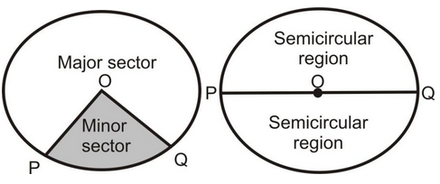 The region between an arc and the two radii, joining the centre to the end points of the arc is called a sector. Like segments, we find that the minor arc corresponds to the minor sector and the major arc corresponds to the major sector. In figure, the region OPQ in the minor sector and the remaining part of the circular region is the major sector. When two arcs are equal, then both segments and both sectors become the same and each is known as a semicircular region.