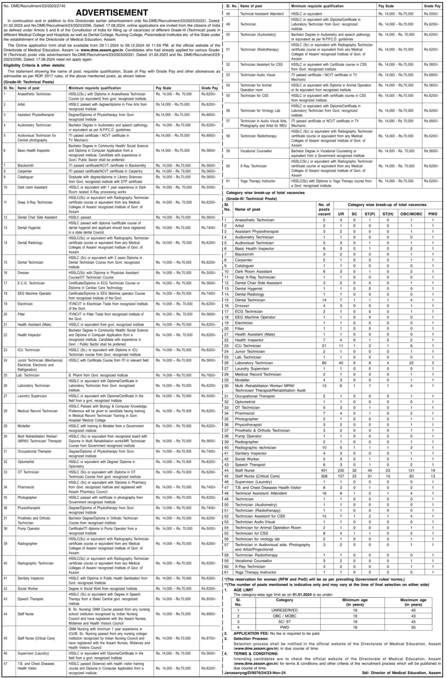 DME Assam Staff Nurse Recruitment 2024: The Directorate of Medical Education (DME), Assam , has released an updated notification inviting online applications for various Grade-III (Technical) Staff Nurse posts. These vacancies span medical colleges, dental colleges, nursing colleges, and paramedical institutes across Assam. Eligible candidates, as defined under Articles 5 and 6 of the Constitution of India, can apply online from 29th November 2024 to 9th December 2024 through the official website, dme.assam.gov.in . Applicants from previous advertisements dated 1st February 2023 and 17th August 2024 need not reapply.