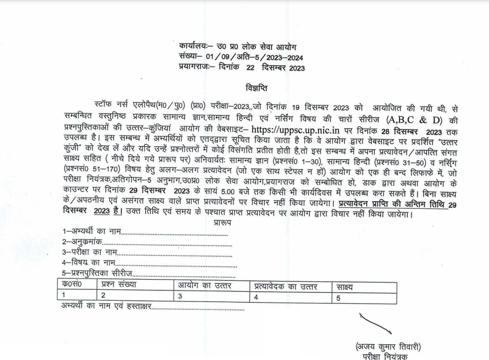 UPPSC authorities share the answer key to give a fair chance to candidates to highlight any discrepancies in the key. The UPPSC Staff Nurse Answer Key 2023 forms the basis of UPPSC Staff Nurse Result 2023 and therefore candidates should immediately go through the key to check for any error. Candidates were required to notify the commission about the same with the valid proof before December 29, 2023, at 5:00 PM as mentioned in the below form: