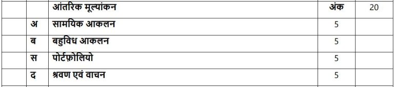 Internal evaluation is worth 20 points in class 10 Hindi course B. You will get 5 points for periodic exams, 5 points for additional evaluations, 5 points for your portfolio, and 5 points for ASL (examination of speaking and listening abilities).