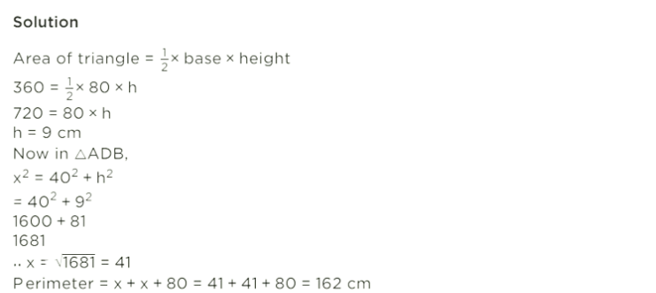 Q. The base of an isosceles triangle measures 80 cm and its area is 360 c m 2 Find the perimeter of the triangle.