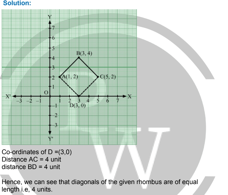 7. Locate the points A(1, 2), B(3, 4) and C(5, 2) on a graph sheet taking suitable axes. Write the coordinates of the fourth point D in order to complete the rhombus ABCD. Measure the diagonals of this rhombus and check whether they are equal or not.