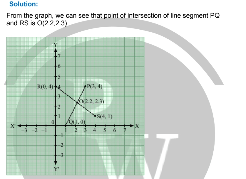 8. Locate the points P(3, 4), Q(1, 0), R(0, 4) and S(4, 1) on a graph sheet and write the coordinates of the point of intersection of line segments PQ and RS.
