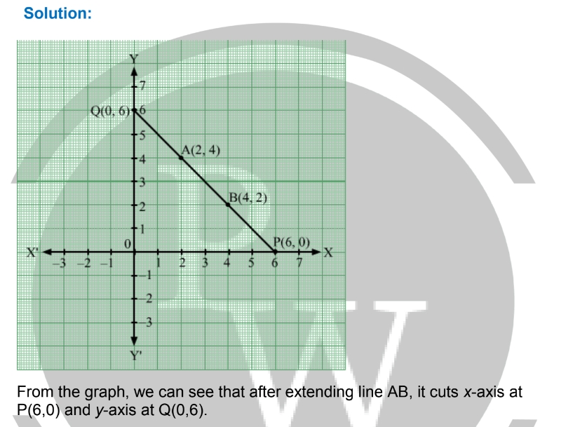 9. Plot the points A(2, 4) and B(4, 2) on a graph sheet and draw a line passing through these two points. Extend the line on both sides to meet the coordinate axes. What are the coordinates of the points where this line meets the x-axis and the y-axis?