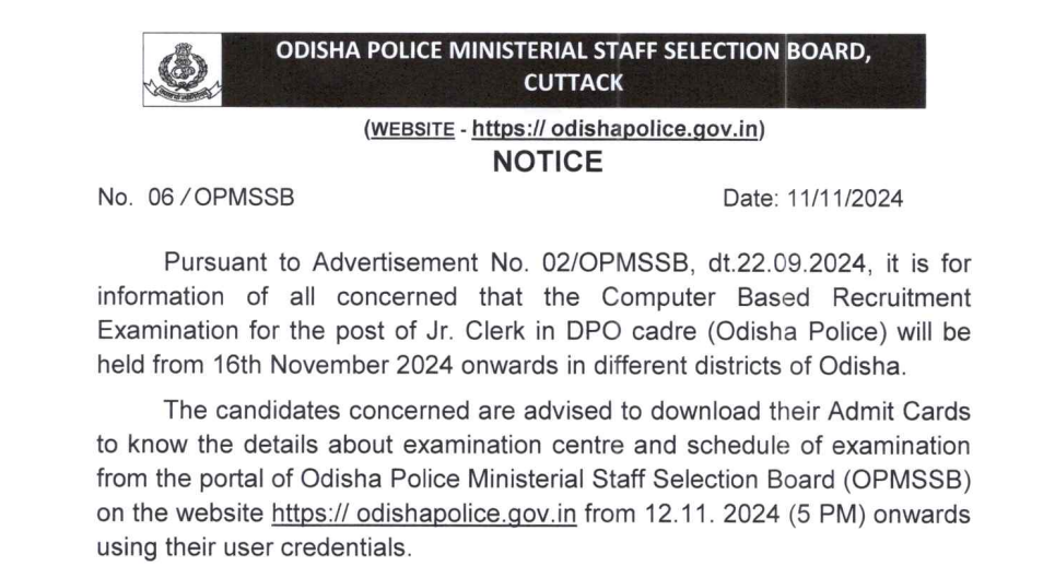 According to Advertisement No. 02/OPMSSB, dt. 22.09.2024 , the Odisha Police Junior Clerk Admit Card 2024 will be available from 12th November 2024 at 5 PM on the official website of the Odisha Police Ministerial Staff Selection Board (OPMSSB). Candidates must download the admit card in advance and carefully review the details regarding their examination center and schedule.