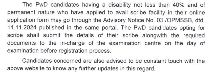PWD candidates with a disability of 40% or more who have applied for a scribe facility must follow Advisory Notice No. 03 /OPMSSB, dtd. 11.11.2024 , published on the OPMSSB website. These candidates should submit the scribe details and supporting documents to the in charge at the examination center before the registration process on exam day.